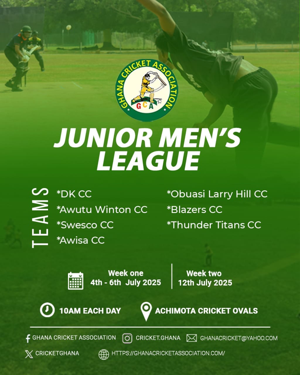 The Ghana Cricket Association (GCA) is thrilled to announce the upcoming Under-19 League, featuring seven teams vying for supremacy. The league, scheduled to take place from July 4th to 12th, 2025, at the Achimota Cricket Oval, promises to be an exciting spectacle that showcases the future of Ghanaian cricket.