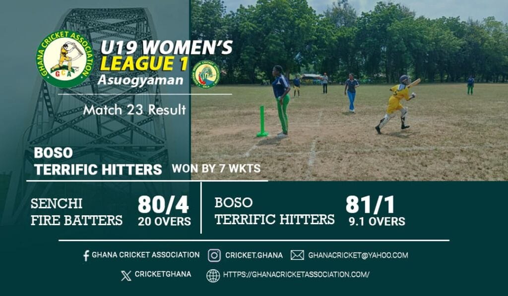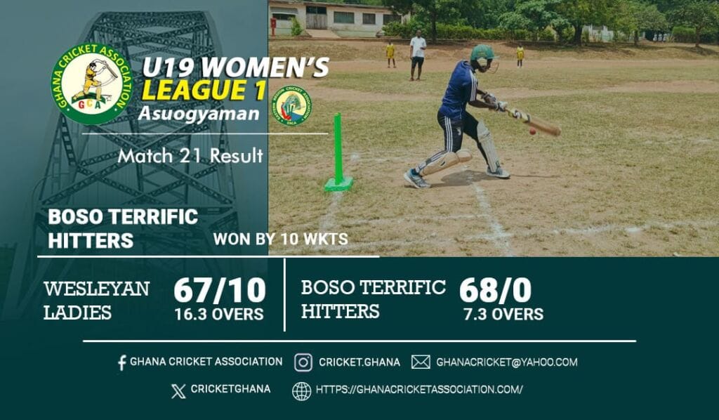 Toss: Wesleyan Ladies won the toss and chose to bat first. Wesleyan Ladies struggled to build momentum, losing all 10 wickets consistently and getting bowled out for a modest total of 67 runs in 16.3 overs. Boso Terrific Hitters chased down the target with ease, showcasing dominant batting without losing a single wicket, scoring 68 runs in 7.3 overs.