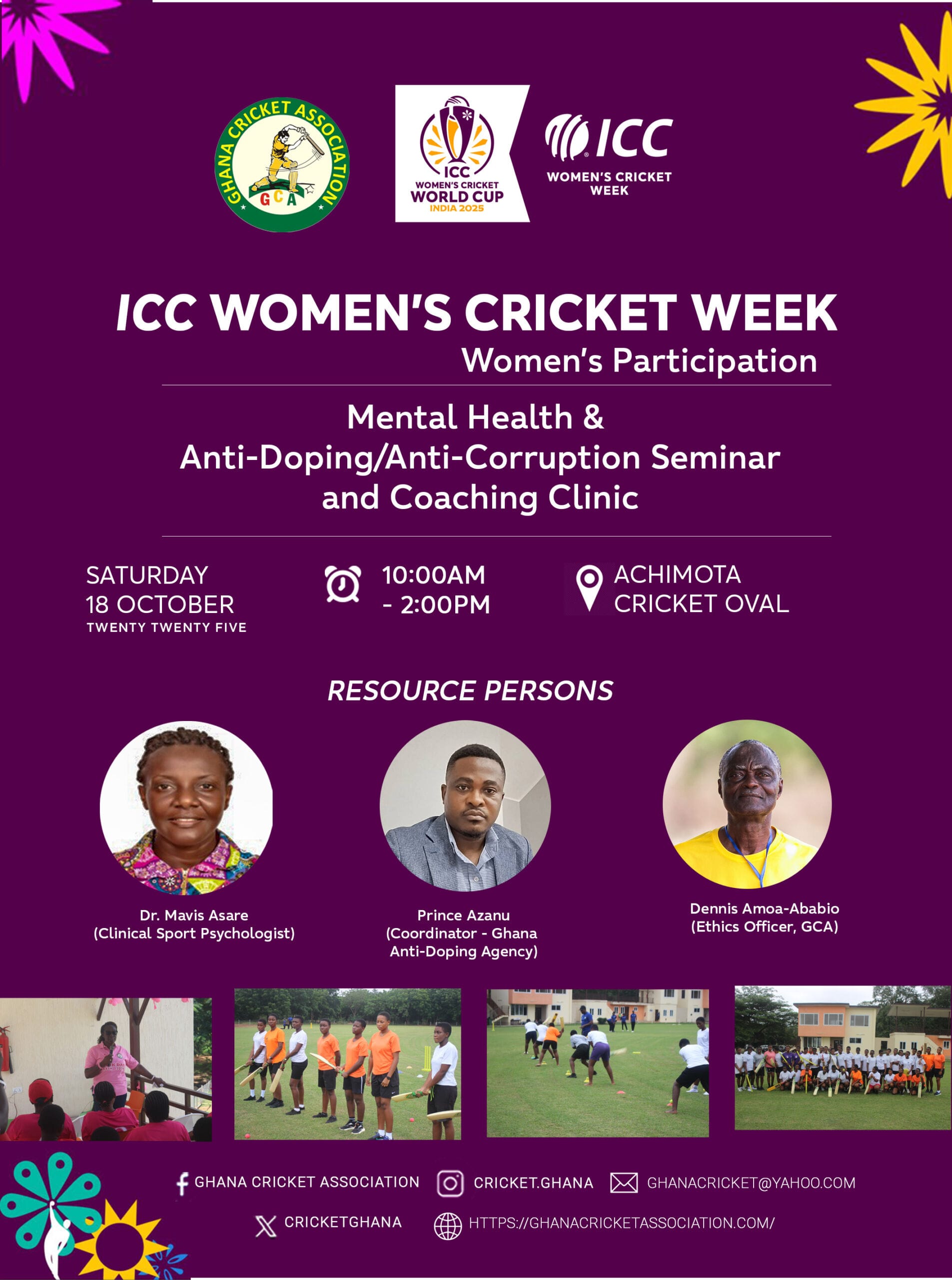 18th of October, The Seminar and Coaching Clinic which will be a half day event, will be held at the Achimota Cricket Oval and is scheduled for the 18th October, 2025. It will start at 9am, closing at 2pm. It is expected that 30 – 40 female players will participate in the seminar and about 50 female students from the Achimota Senior High School will undergo the Coaching Clinic, which will commence after the seminar.