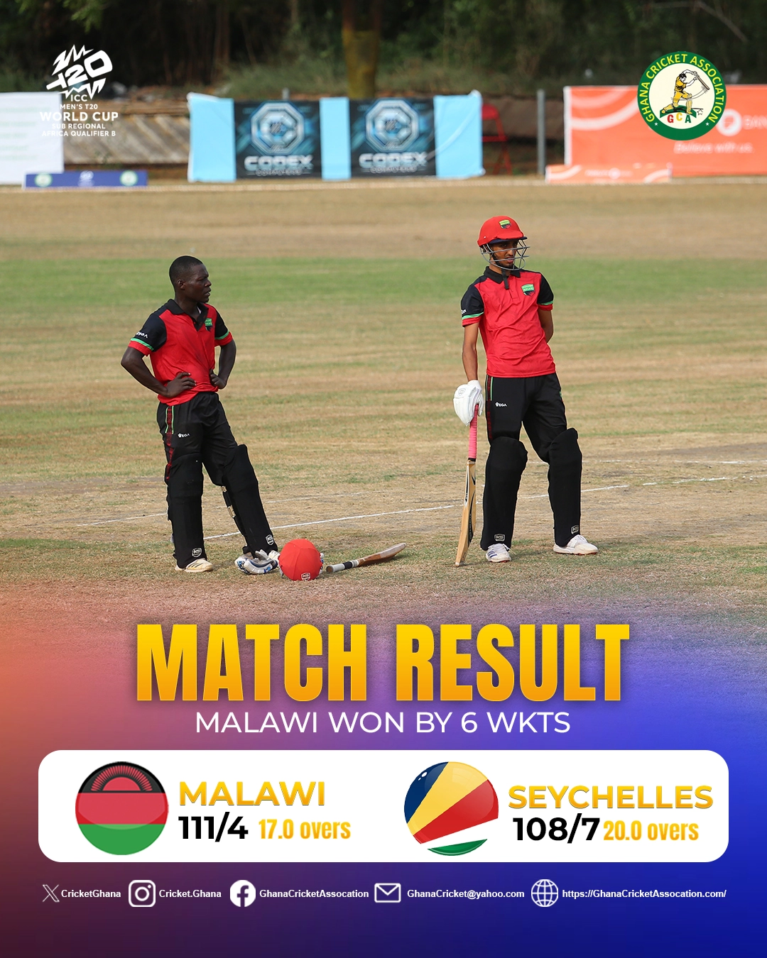 In the ongoing ICC Men’s T20 World Cup Sub Regional Africa Qualifier B, Malawi secured a confident 6-wicket win against Seychelles in a well-contested encounter.